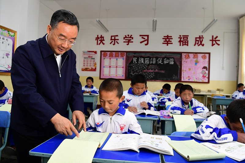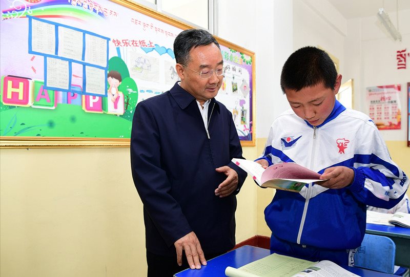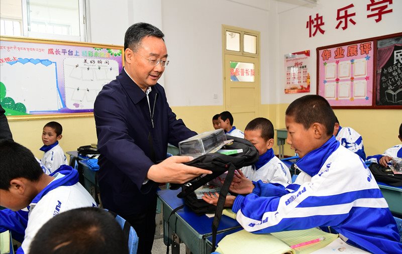 合作市第四小学是一所双语类全日制寄宿制小学。学校现有学生1167人,全部为藏族,其中有两个班共39人是控辍保学劝返学生。唐仁健看望了这两个班的学生,孩子们正在认真写作业。三年级的尕藏才让现场朗读了课文《我身边的人》,声音响亮,吐字清晰,唐仁健连声夸赞,鼓励他继续努力。随后,唐仁健给每个孩子送上文具盒、童话书、书包等礼物,祝孩子们节日快乐、健康成长。他说,现在大家正是读书的年纪,记忆好、反应快,要珍惜失而复得的读书机会,认真学知识,努力长本领,长大了以后把家乡建设得更加美好,把祖国建设得更加繁荣富强。唐仁健详细询问控辍保学工作和劝返孩子的教学组织安排情况。他强调,要应劝尽劝、应返尽返,结合“3+1”冲刺清零工作,逐村逐户逐人摸排,真正做到无遗漏。要因人施教,根据劝返孩子的不同情况,科学合理组织教学、设计课程、安排师资,确保孩子们坐得住、学得进、学得好。