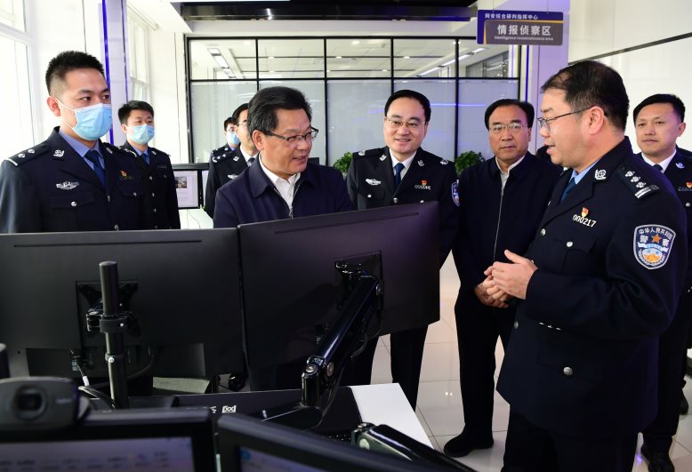 任振鹤先后走进网安综合研判指挥中心、合成作战中心,详细了解打击网络违法犯罪、网络安全管理防护、合成作战实体运行、疫情防控预警平台和甘肃公安“大基础”建设等情况。他强调,过不了互联网这一关,就过不了长期执政这一关,要统筹发展安全两件大事、网上网下两个战场,坚持把信息化智能化作为推动公安工作创新发展的大引擎,各类平台既要建好、更要用好,持续打造数据警务、智慧公安,有效提高打击犯罪、快速破案能力和各类风险化解、管控能力。要坚持以人民期盼为念、为人民利益而战,始终保持对黑恶势力犯罪的严打高压态势,加强对突出违法犯罪问题打击,在经济领域守护百姓的“钱袋子”,在民生领域解决百姓的“揪心事”,在网络领域给百姓以“清朗空间”,努力让人民群众感受到公平正义就在身边。要大抓基层、大抓基础,坚持和发展新时代“枫桥经验”,深入抓好“枫桥式公安派出所”创建工作,从源头治起、从细处抓起、从短板补起,将工作触角扎根群众之中,用坚实脚步丈量民情民意,以警民共治实现和谐稳定,真正以“基础实”赢得“百姓安”。