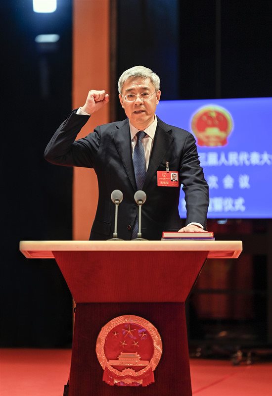 新当选的甘肃省第十三届人民代表大会常务委员会主任尹弘进行宪法宣誓。