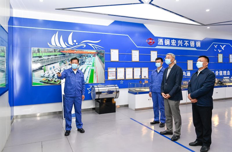 酒钢(集团)宏兴股份有限公司不锈钢分公司是国内第三家拥有炼钢、热轧到冷轧完整配套的全流程不锈钢生产企业。尹弘参观产品展示,了解酒钢集团生产经营和钢铁产业发展情况,并深入生产线察看不锈钢加工情况。他强调,碳达峰、碳中和对钢铁企业是挑战更是机遇。要抢抓新一轮能源发展机遇,坚持以供给侧结构性改革为主线,以改革创新为根本动力,加强创新链和产业链对接,推进钢铁与相关产业耦合发展,推动传统产业智能化、高端化、绿色化改造,促进全产业链优化升级。要牢固树立质量为先、品牌引领意识,瞄准市场需求、对标世界一流,加大关键核心技术攻坚力度,加快科技成果转化,以高端产品占领市场,不断提高产业实力和全球竞争力。要坚持生态优先、绿色发展,严守生态环保底线,依托我省丰富的新能源资源优势,加快节能降耗和减污降碳,持续降低碳排放强度,不断提升本质安全水平,防范各类风险隐患,推动企业绿色低碳、持续健康发展。