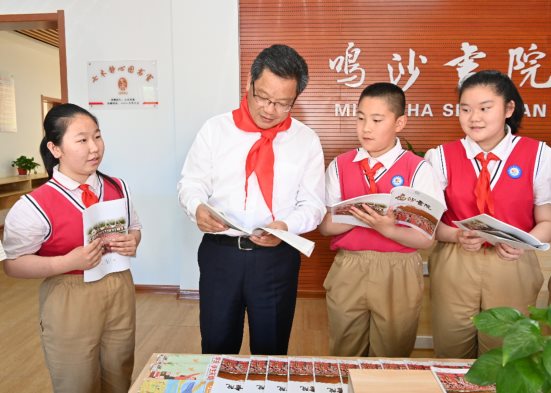 敦煌市东街小学始建于1750年,前身是“鸣沙书院”。任振鹤走进校园,认真听取办学情况介绍,仔细观看“童心向党”学生成果展示,参加少先队员入队仪式,向新入队的少先队员表示祝贺。学校的图书室、音乐舞蹈教室、美术教室里,孩子们正在认真阅读、开心歌唱、用心创作,任振鹤看望孩子们并向他们赠送了图书、乐器和彩笔,祝他们节日快乐。他说,你们是祖国的花朵、民族的希望、国家的未来,是实现第二个百年奋斗目标的生力军、主力军。希望大家始终牢记习近平总书记殷切教导和期望,坚持品德为先,树立远大志向,打牢知识基础,勤于锻炼身体,浸润书香、开蒙养正、知行合一,争做新时代的好少年。