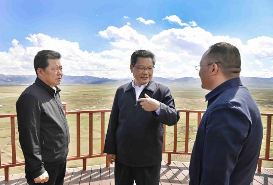 在玛曲县黄河新特大桥和阿万仓湿地,任振鹤实地察看黄河上游水源涵养区山水林田湖草沙一体化保护和修复情况。他强调,要准确把握“重在保护、要在治理”的战略要求,坚持“保”字为先、“绿”字为本、“治”字为要,更加注重综合治理、系统治理、源头治理,深入实施生态保护修复和建设工程,推动流域生态环境持续改善、生态系统持续优化、整体功能持续提升。要以促进黄河生态系统良性永续循环、增强生态屏障质量效能为出发点,遵循自然规律,尊重自然、顺应自然、保护自然,始终把绿色作为发展生命,加强黄河上游水源涵养能力建设,筑牢“中华水塔”。在迭部县益哇镇扎尕那村、达拉乡俄界村、旺藏镇旺藏村、尼傲乡叠山小八戒甘南养殖示范基地和夏河县阿木去乎镇黑力宁巴村,任振鹤与干部群众、企业负责人等深入交谈,详细了解乡村旅游、产业发展等情况。他强调,要把增加群众收入作为根本举措,把推进发展方式转变作为主攻方向,把乡村建设和治理作为重要任务,做深做细“生态+”文章,巩固拓展脱贫攻坚成果,全面推进乡村振兴,带领群众朝着共同富裕的目标稳步前进。