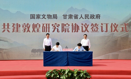 省委常委、兰州市委书记朱天舒主持。国家文物局副局长陆进与副省长何伟代表双方签署《国家文物局 甘肃省人民政府共建敦煌研究院协议》,与会领导见证签约并参观甘肃省博物馆有关展览。
