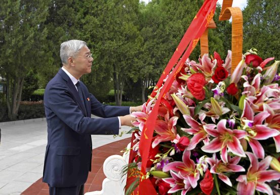 红军会宁会师旧址松柏苍翠、庄严肃穆,会师纪念塔巍然屹立。尹弘等在纪念塔前肃立,怀着无比崇敬的心情,向革命烈士敬献花篮。伴着雄浑低沉的《献花曲》,尹弘缓步上前,仔细整理缎带。随后,大家一起向革命先烈三鞠躬,并缓步绕行、瞻仰纪念塔,表达对革命先烈的深切缅怀。